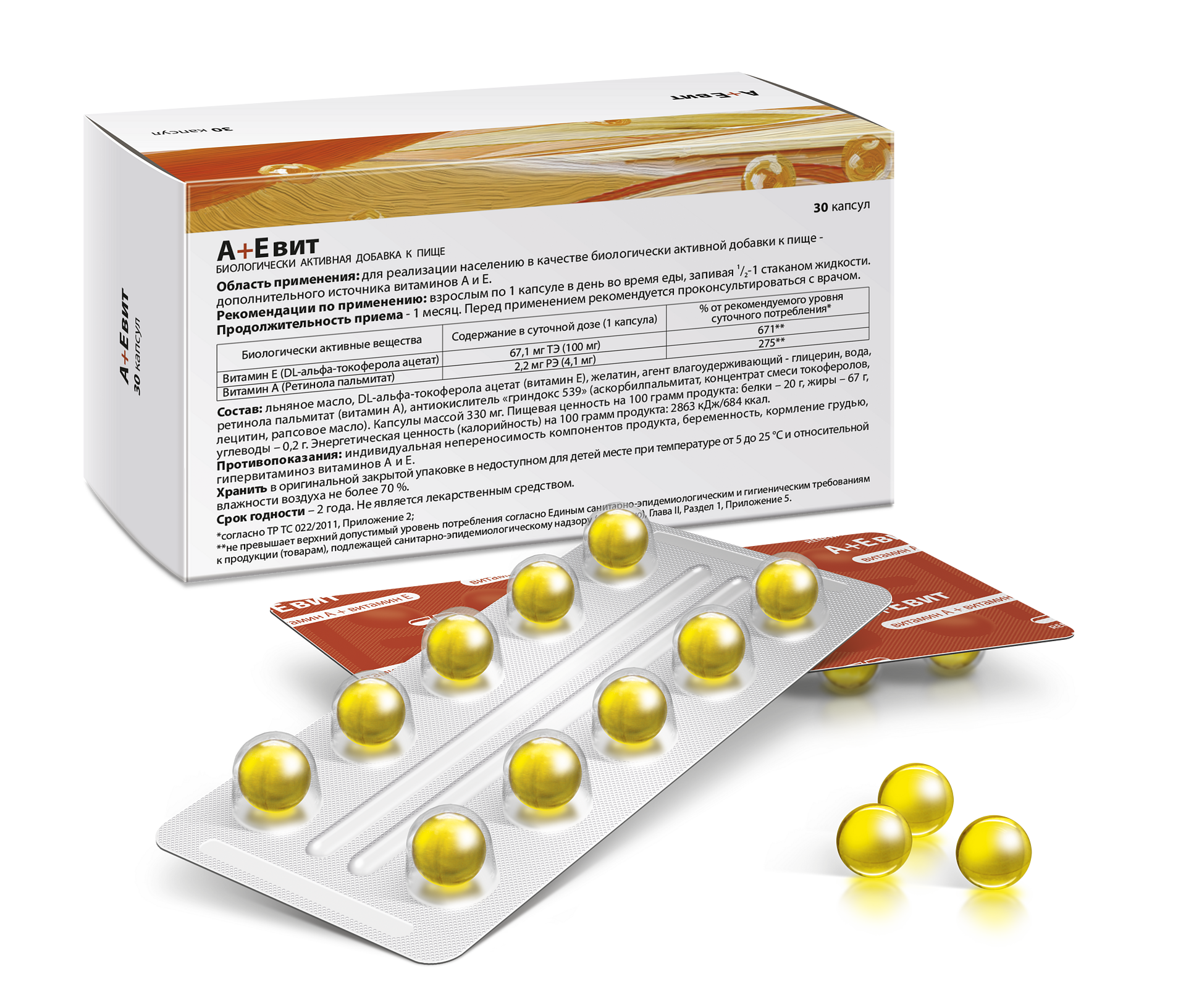 Витаминный комплекс Аевит №30. Содержит витамины А и Е, льняное масло, полиненасыщенные жирные кислоты омега-3, омега-6. Витамины А и Е улучшают состояние кожи, укрепляют волосы, способствуют восстановлению зрения. Льняное масло помогает усвоению витаминов А и Е. Жирные кислоты,