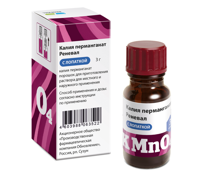 Антисептическое средство. При соприкосновении с органическими веществами выделяет атомарный кислород. Образующийся при восстановлении калия перманганата марганца оксид образует с белками комплексные соединения – альбуминаты (за счет этого калия перманганат в малых концентрациях оказывает вяжущее, а в концентрированных растворах – раздражающее, прижигающее и дубящее действие). Обладает также дезодорирующим эффектом. Эффективен при лечении ожогов и язв.